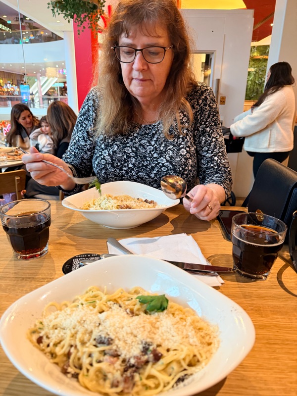 Innan vi tog oss till Winery Hotel så tog vi pendeln till Solna och besökte MOS för fika och lunch. Mycket folk i vanlig ordning. Vädret är grått och regnigt så vi var in på Åhléns och köpte paraplyer. Oerhört bra och service minded personal. Fika blev det på Starbucks och lunchen på Vapiano en helt ok Carbonara.Nu har vi precis checkat in på Winery.