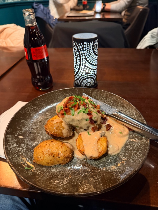 Även i dag blev det lunch på lokal. De serverade Wallenbergare på Bryggans. Gott.